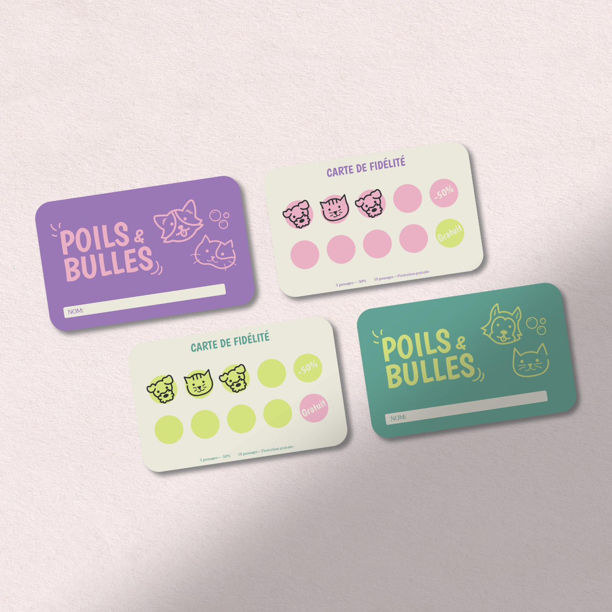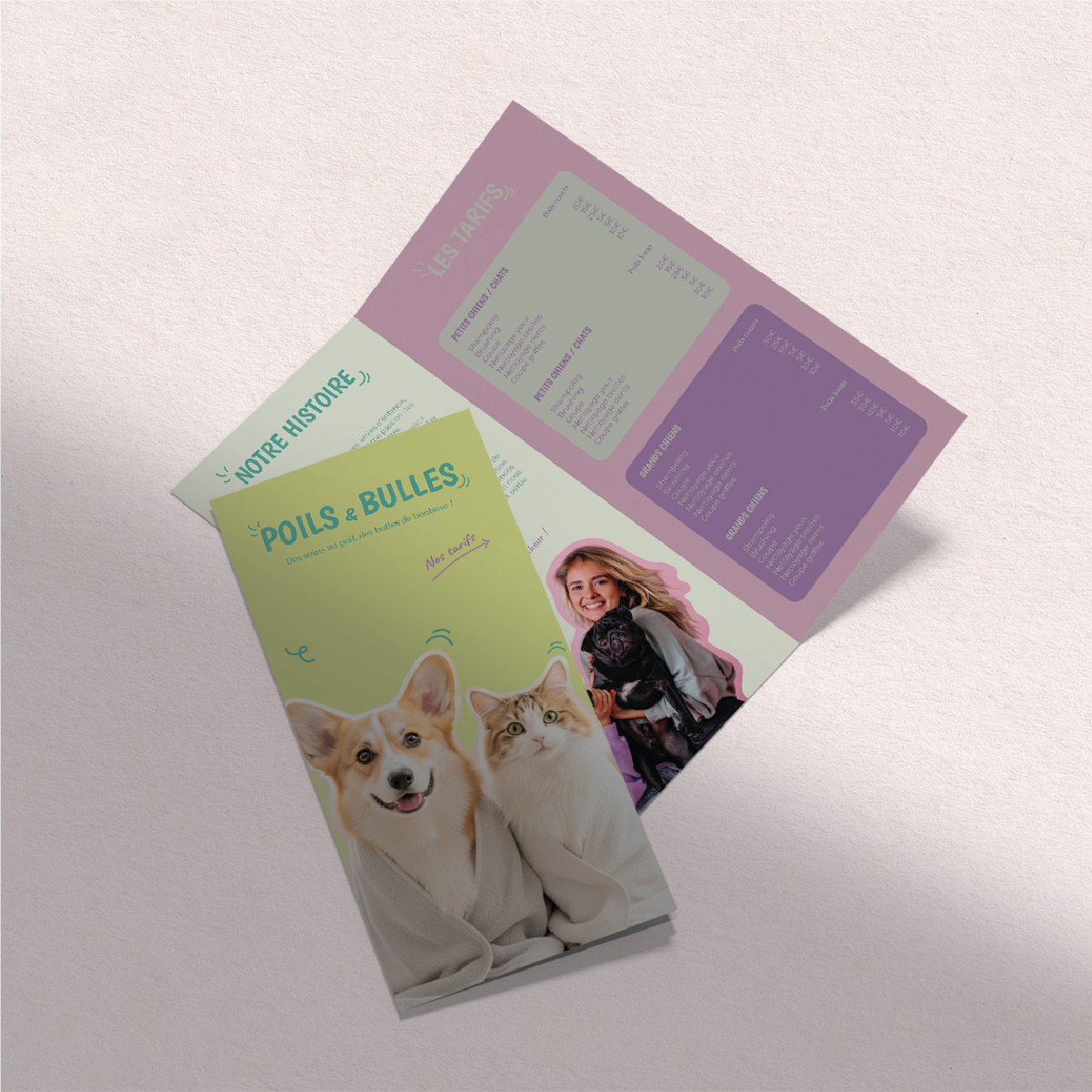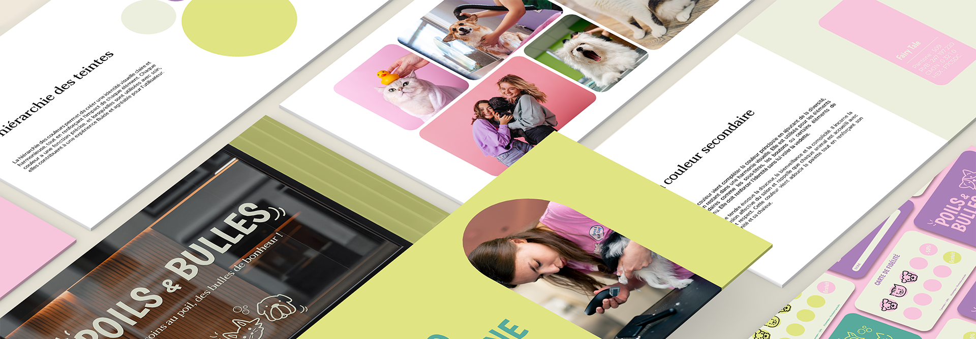 Cette identité visuelle reflète l’esprit de Poils & Bulles : un salon moderne, accueillant et plein de vie, où le bien-être animal est au centre de tout. La palette de couleurs mêle douceur et énergie. La typographie principale apporte une touche ludique, tandis que la secondaire assure clarté et professionnalisme tout en conservant une note de douceur. L’univers photographique, lumineux et naturel, illustre la complicité et la joie partagées avec les animaux.
